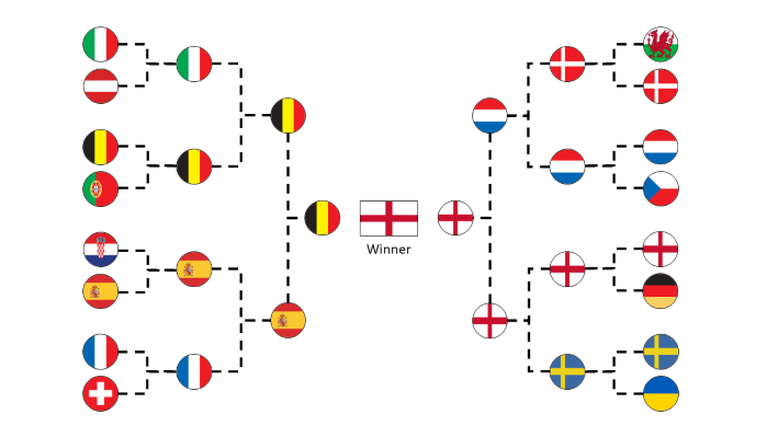 England currently comes out as favourite to become champion! They are not the strongest team in the competition, but home advantage in the round of 16, semi-final and final gives them the edge. In fact, the Sportcompass Ranking only has them on 6th place. However, the five teams ranked ahead of England (Belgium, Spain, Italy, France, Portugal) are all in the other half of the bracket. That means England can only face them in the final. To put things into perspective, England still has a greater chance to be knocked out in the Round of 16 against Germany (38.1%) than to reach the final (28.2%). Every single match can completely change the picture.